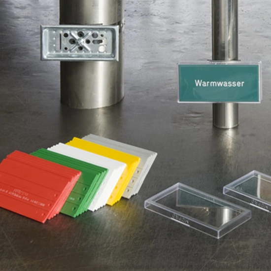 Das Beschilderungssystem ermöglicht eine normgerechte Kennzeichnung von Rohr- und Lüftungsleitungen sowie die Beschilderung in anderen Anwendungsgebieten wie in Krankenhäusern, Schulen oder Büro- und Dienstleistungszentren. Die Schilder sind in verschiedenen Farben und Werkstoffen erhältlich und können für eine hohe Haltbarkeit auch individuell graviert oder bedruckt werden.
